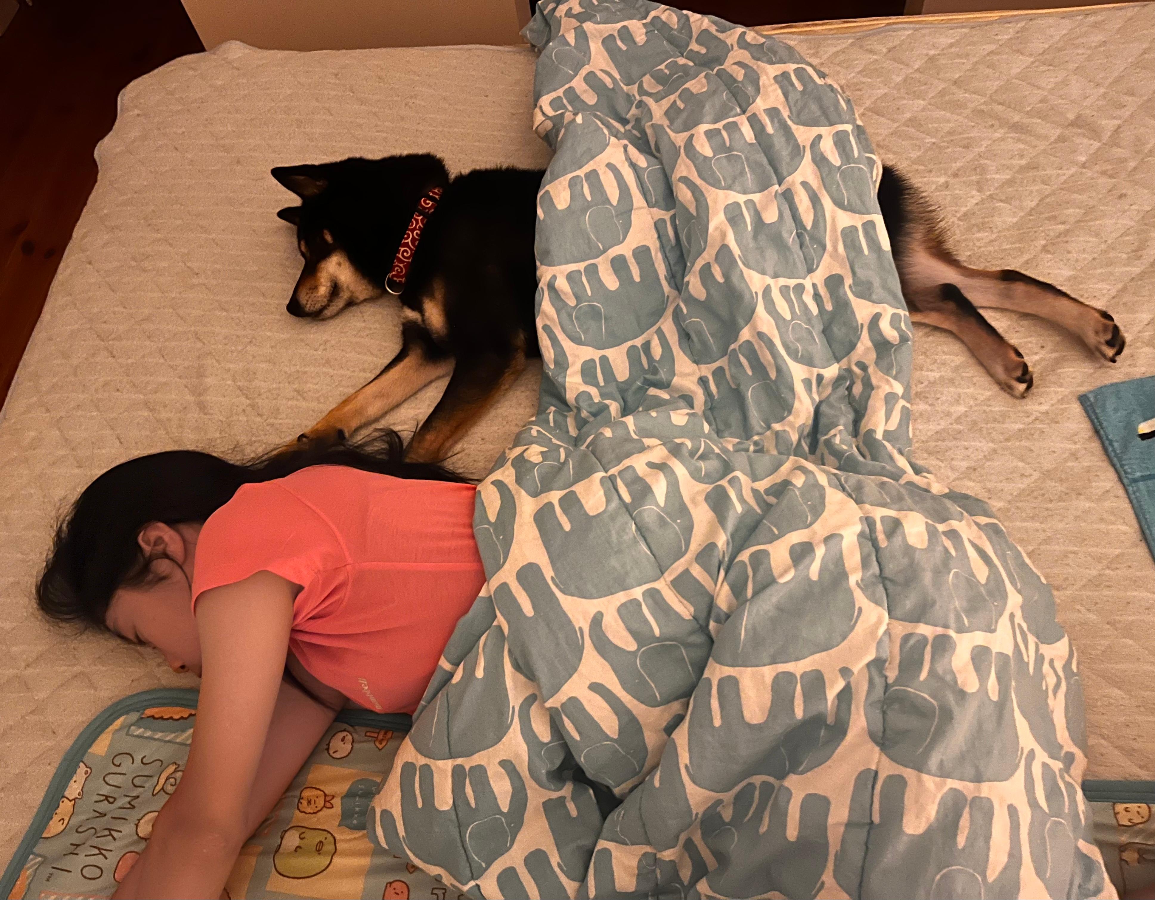 作品名『心も身体も「シンクロ」』 投稿ネーム 佐藤 美和子 さん 作品エピソード いつも自分の寝床でイビキをかいている豆助。その日は、先に寝ていた大好きな娘の布団へトコトコ…隣に寄り添い夢心地。気づいた娘が、そっと布団を掛けてあげたとの事。シンクロ姿に心が和みます。 |