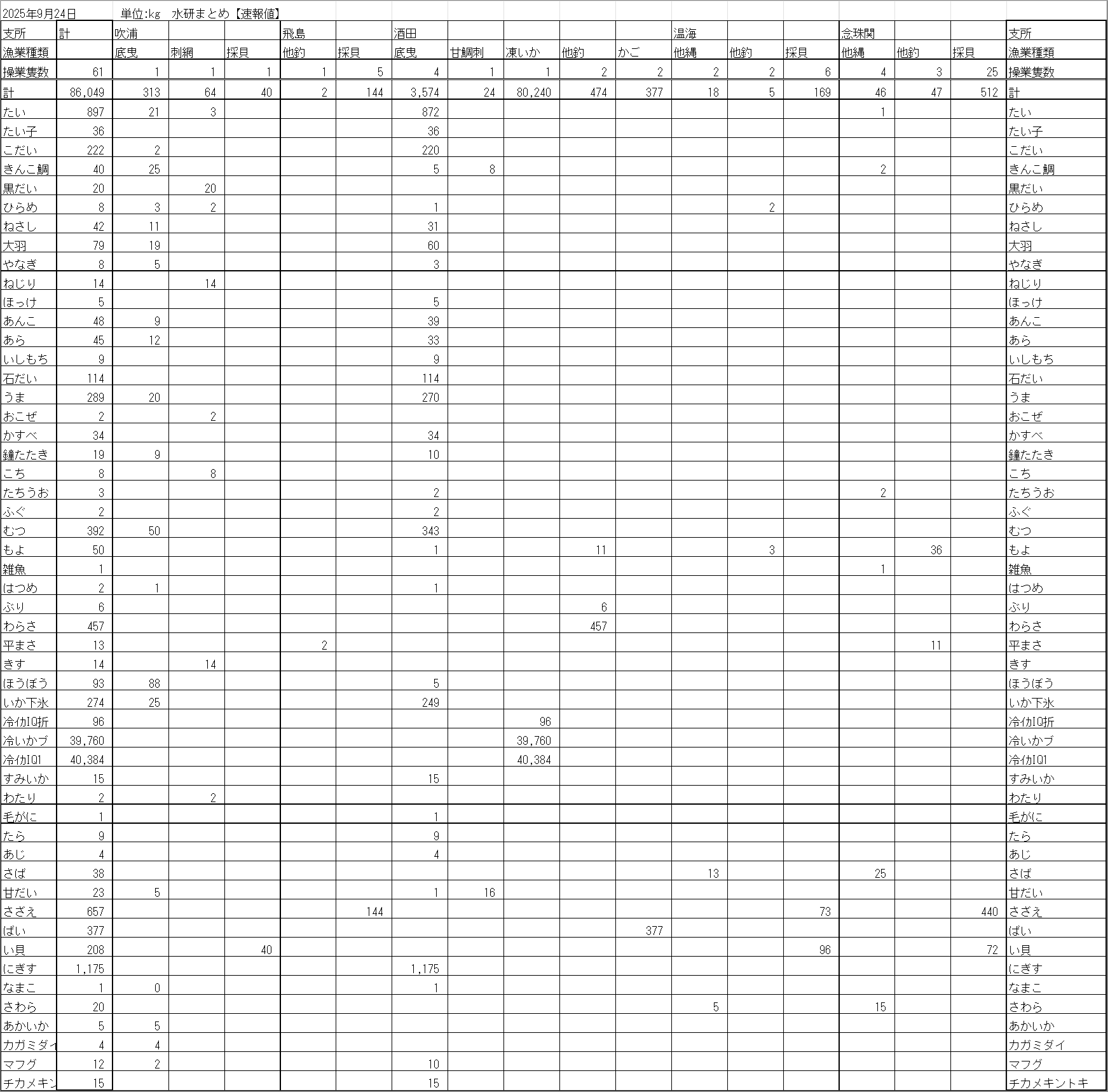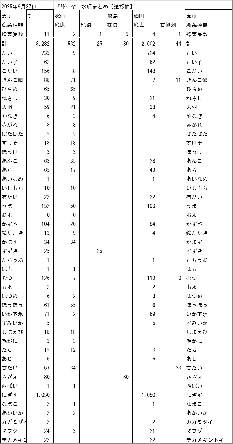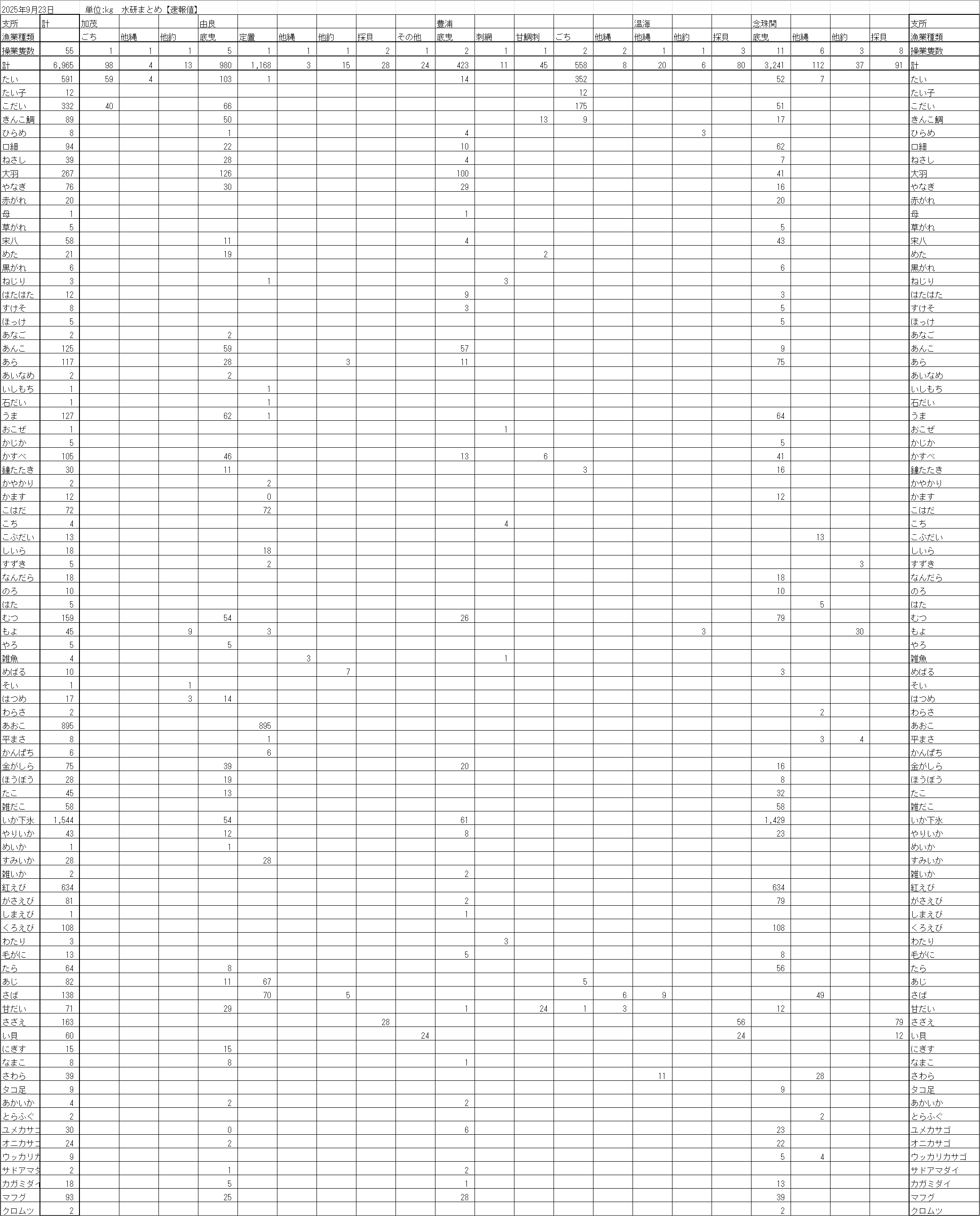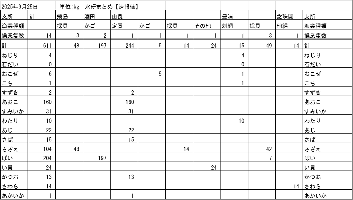 最近の庄内浜各地の水揚げ状況を、支所別・漁業種類別・魚種別に表示しています。