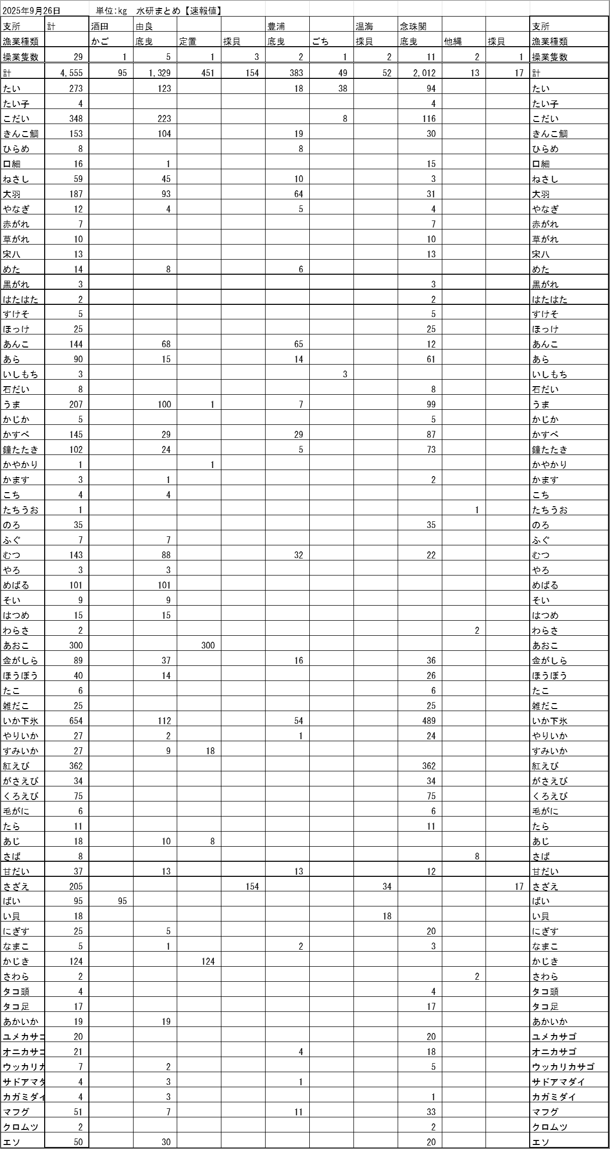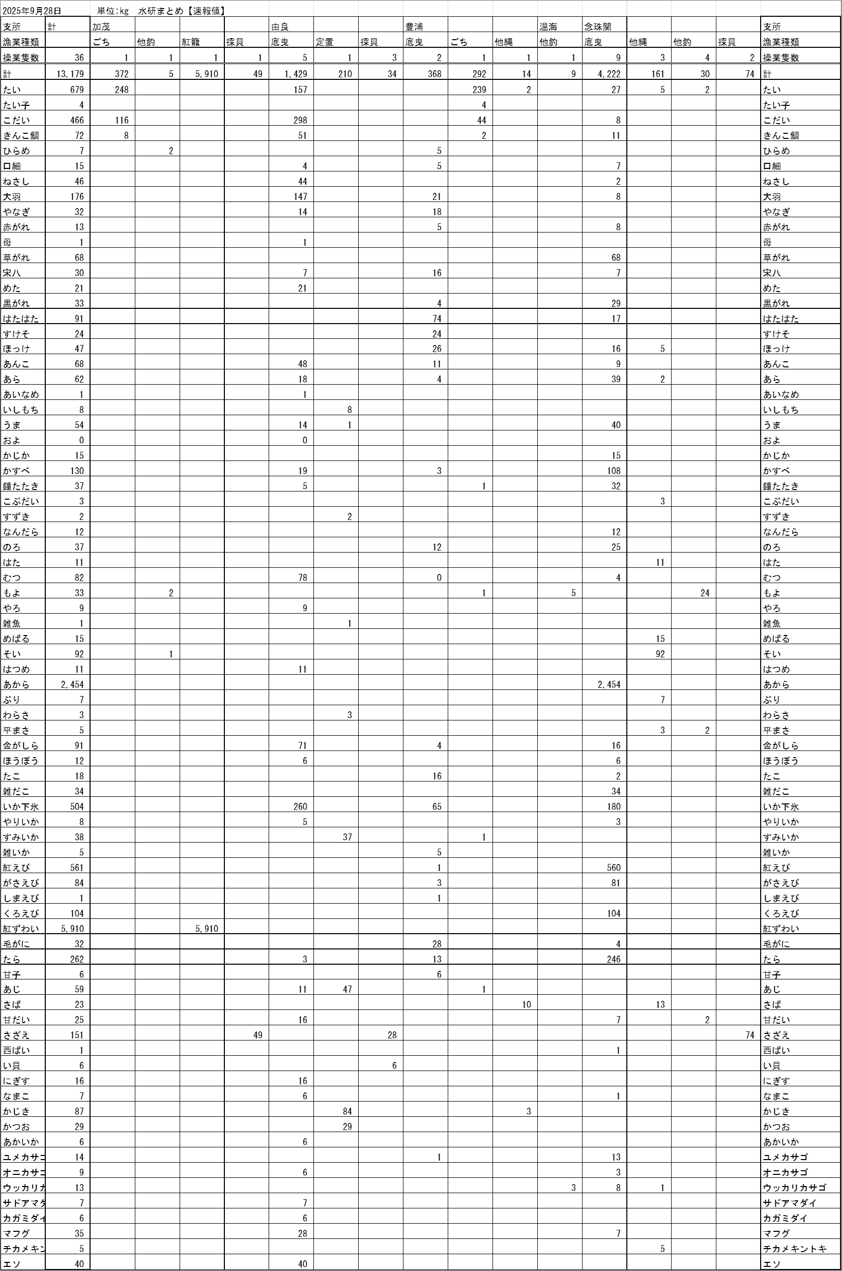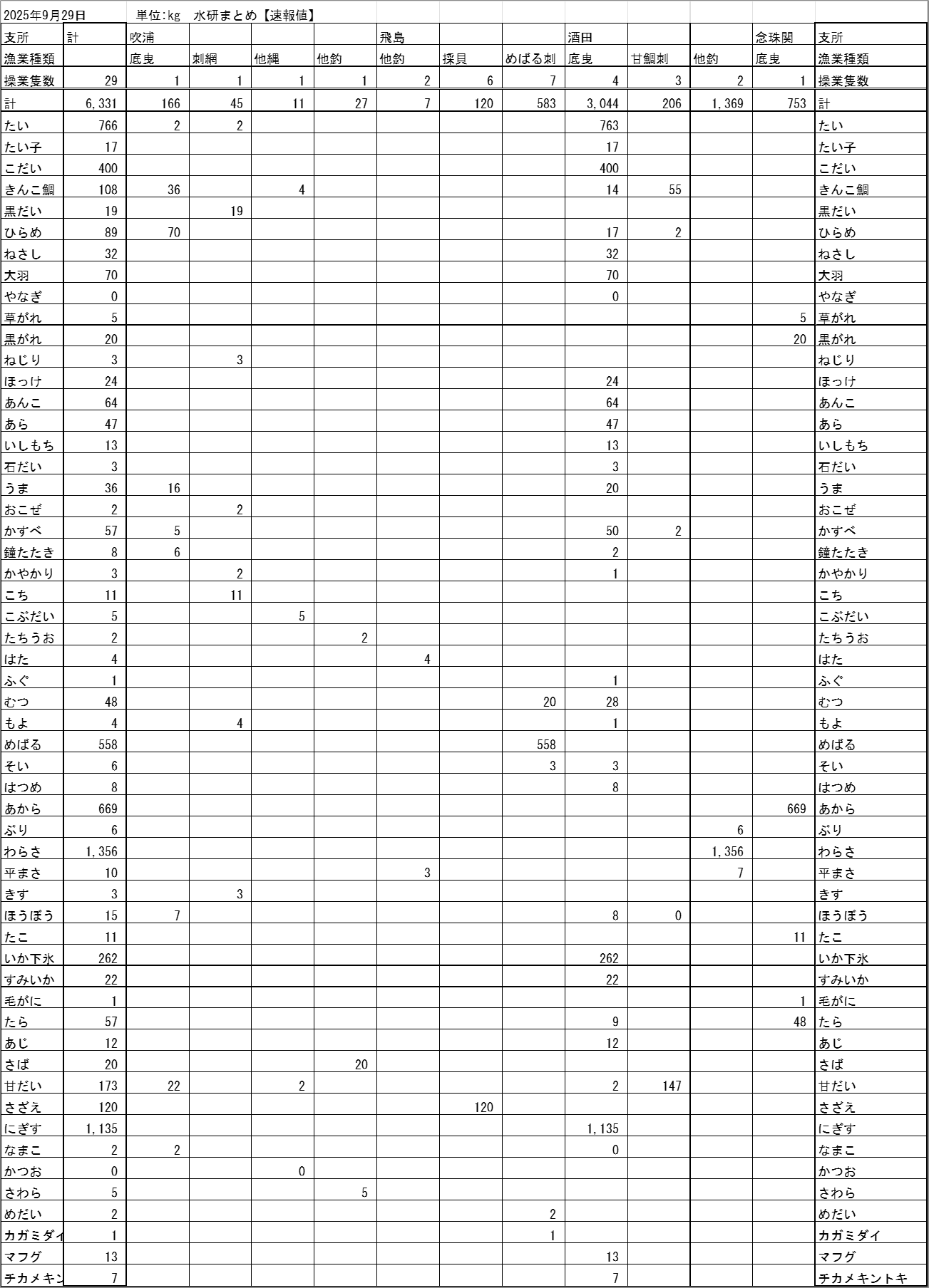 最近の庄内浜各地の水揚げ状況を、支所別・漁業種類別・魚種別に表示しています。